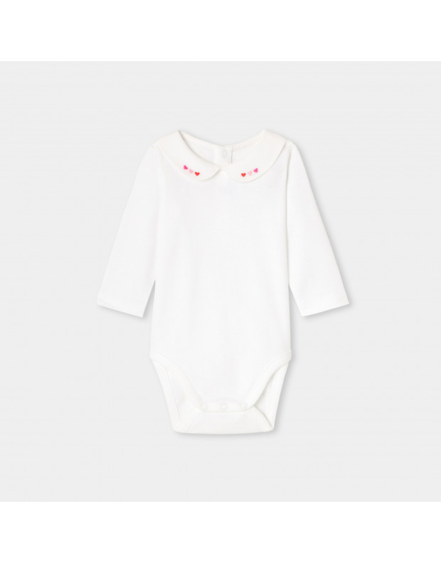 A staple of the Jacadi wardrobe, this essential baby girl bodysuit made from mostly organic cotton features a Peter Pan collar hand-embroidered with tiny flowers. Practical for everyday wear, its press stud fastenings at the back and crotch make it easy to dress your baby. A chic and versatile style that can be worn under a romper or dress.